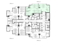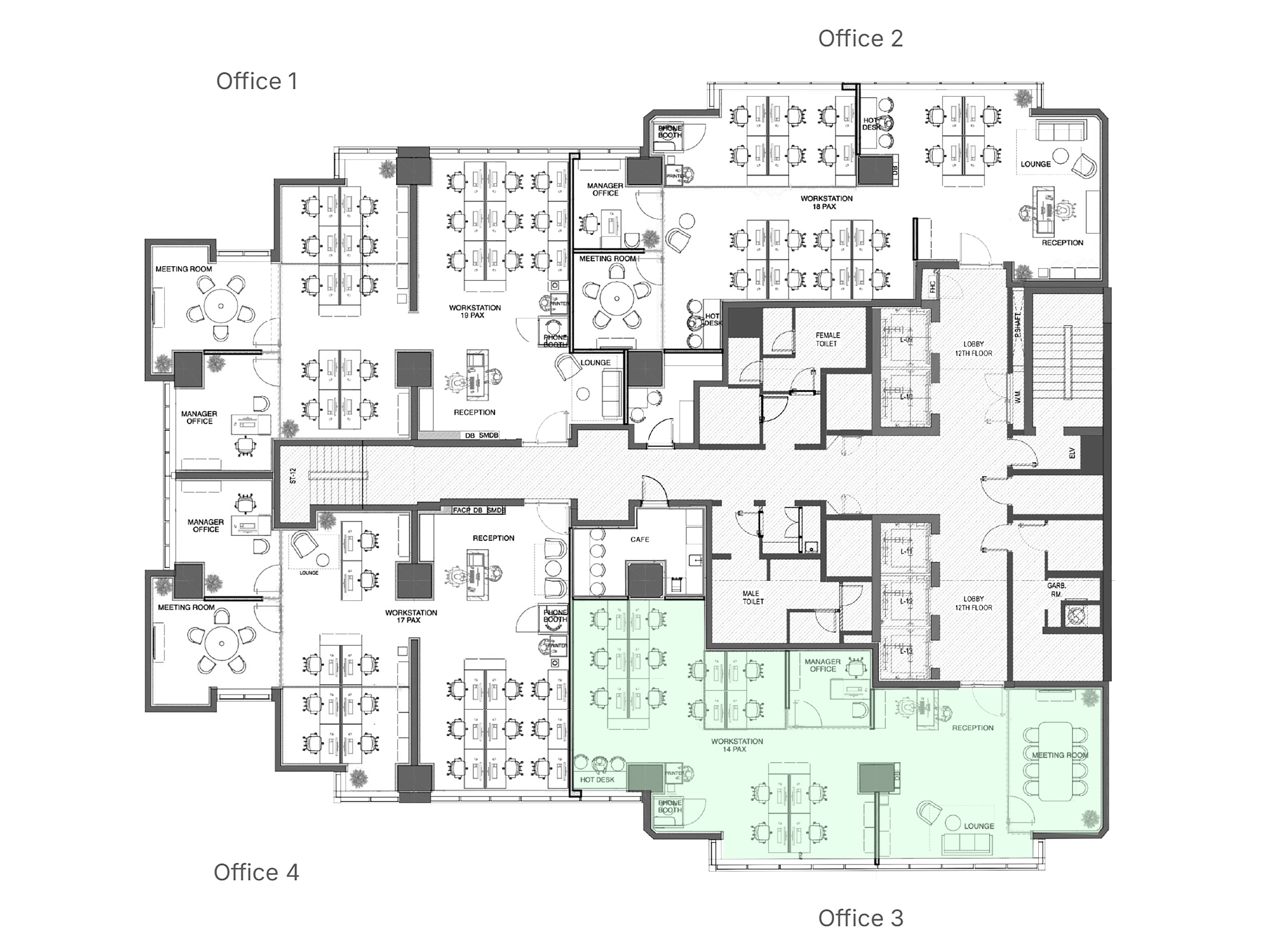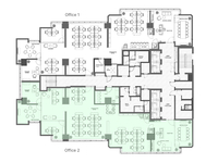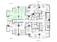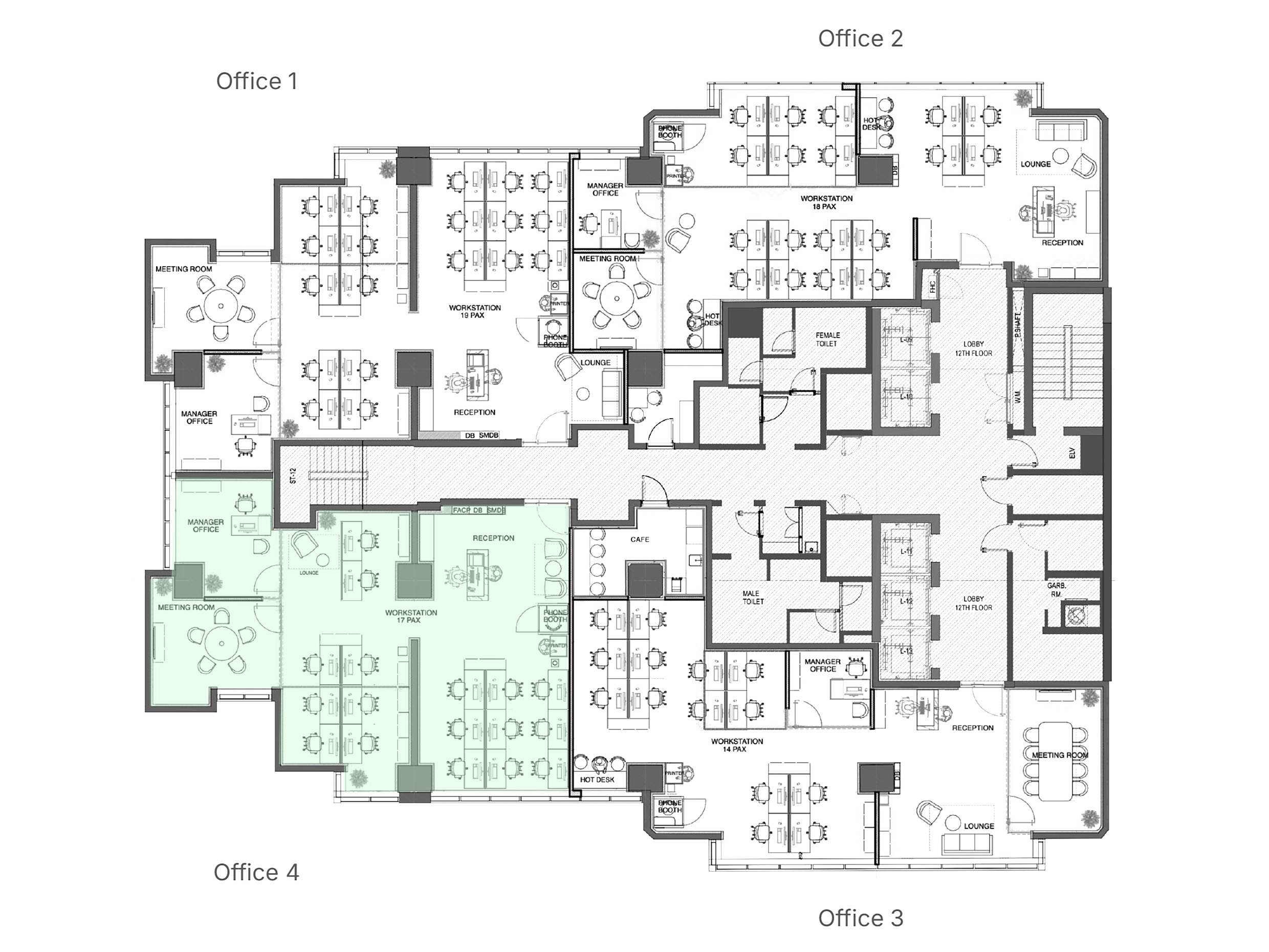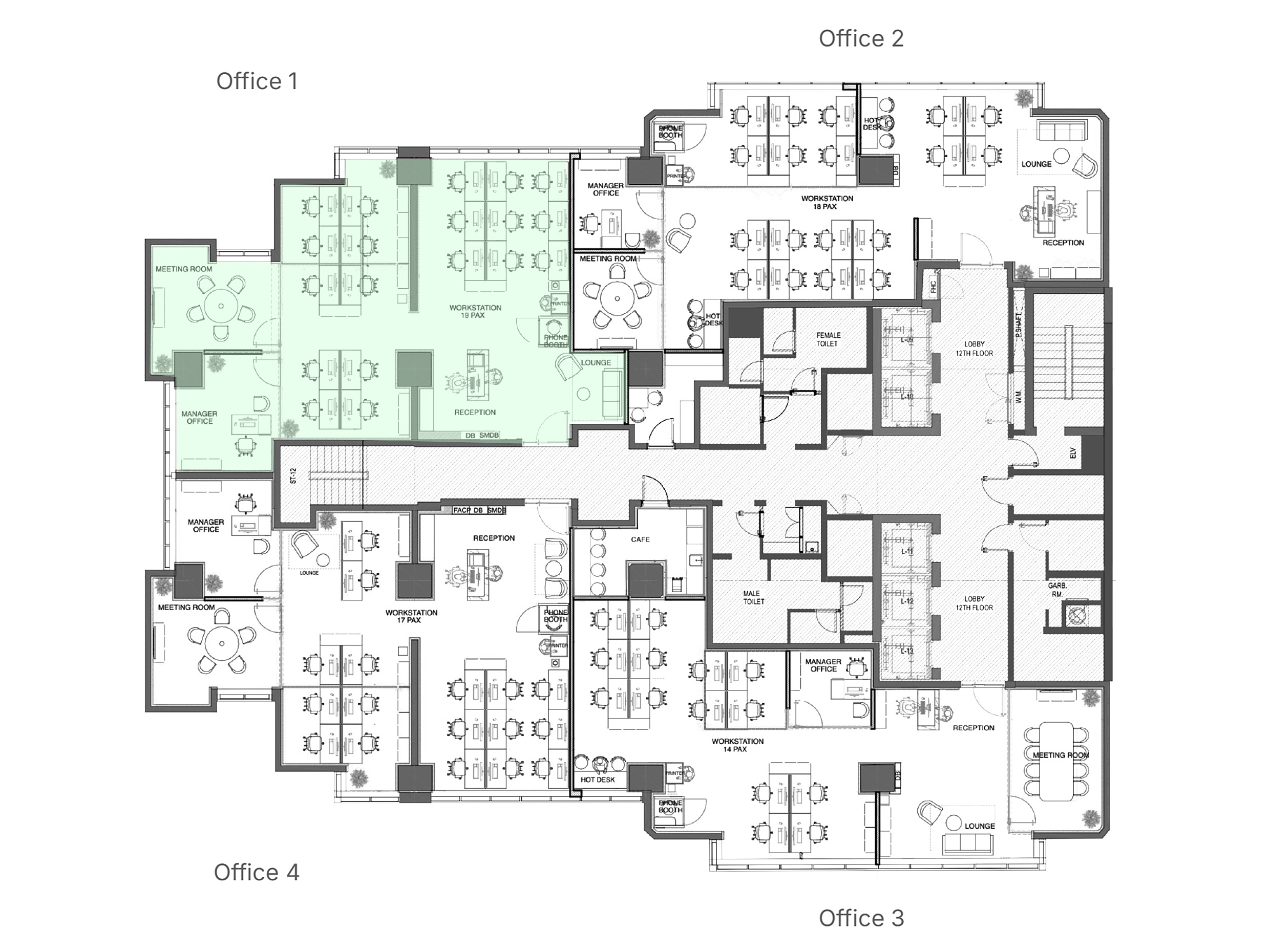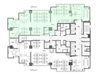 The workspace is based on a mixed-layout concept, offering both open-plan areas and private offices. This flexible design allows tenants to configure the space according to their operational needs. High ceilings and large windows provide ample natural light, creating a productive and inspiring environment.